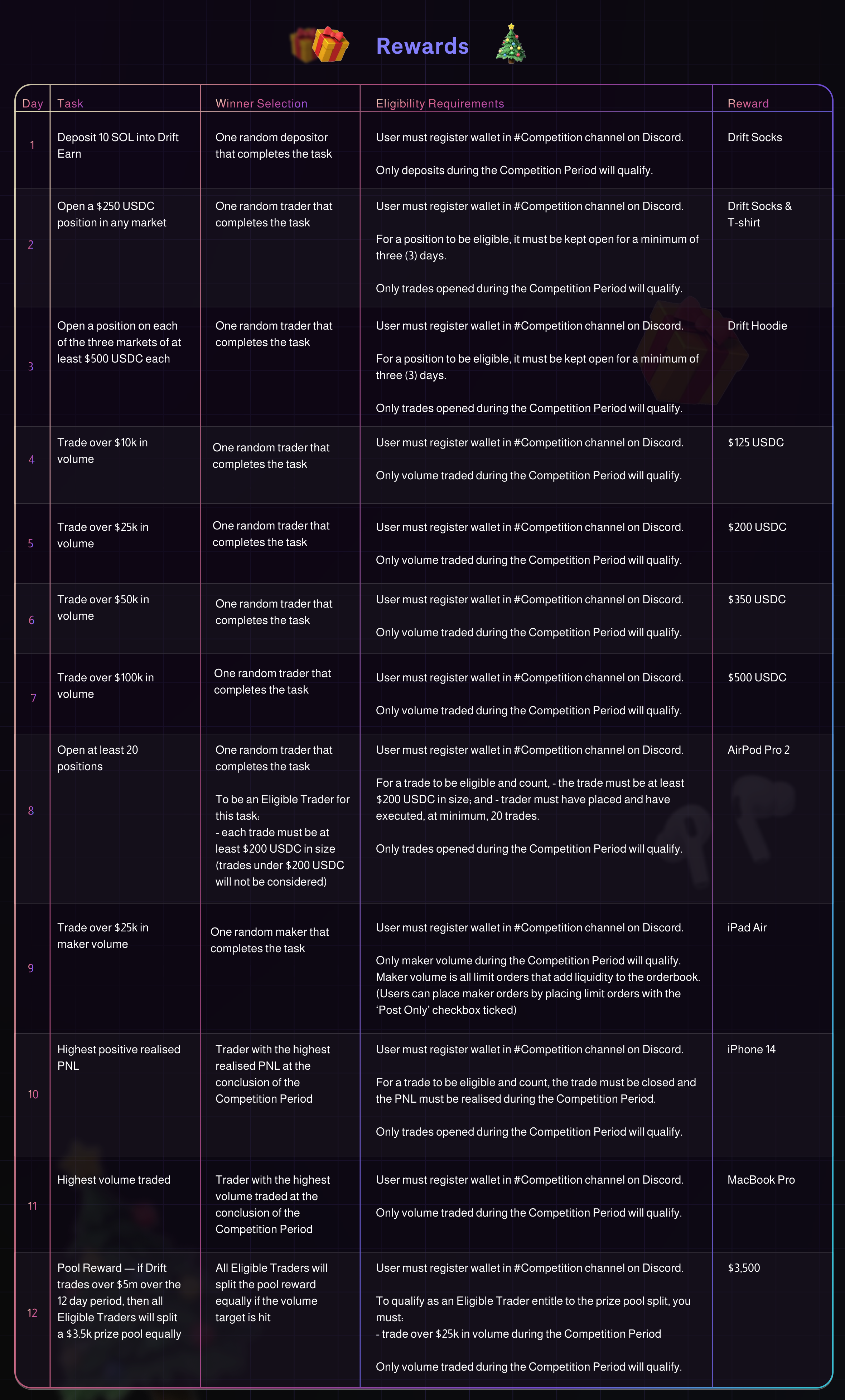 Note: only wallets that have been enrolled through the #competitions channel in Drift’s Discord will be eligible for the Driftmas prizes. Wallets can be enrolled at any point during the Competition Period.