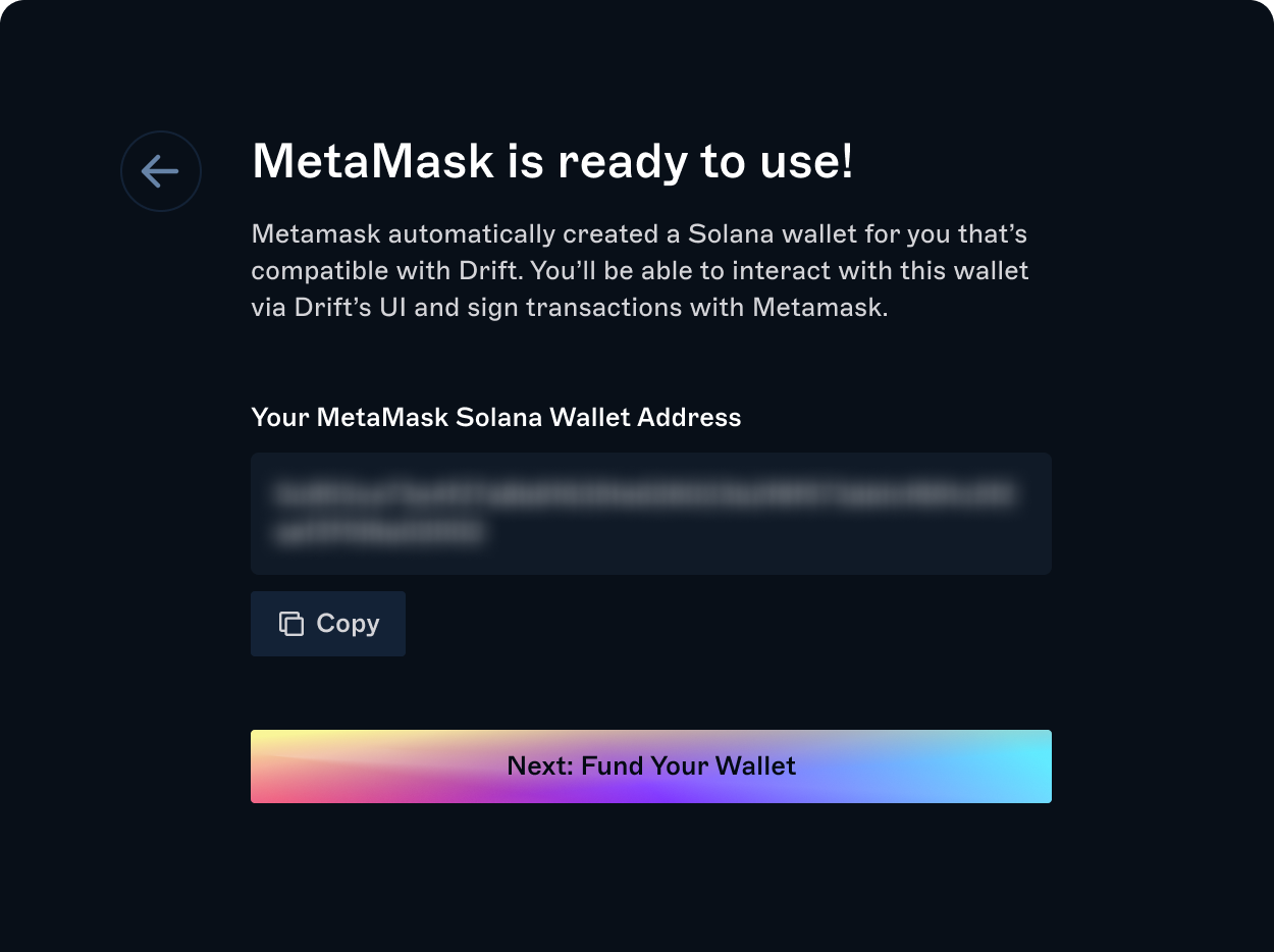To start trading on Drift, your new MetaMask wallet will need SOL for transaction fees and you'll need to deposit collateral onto Drift. The onboarding flow will guide you from one step to the next.