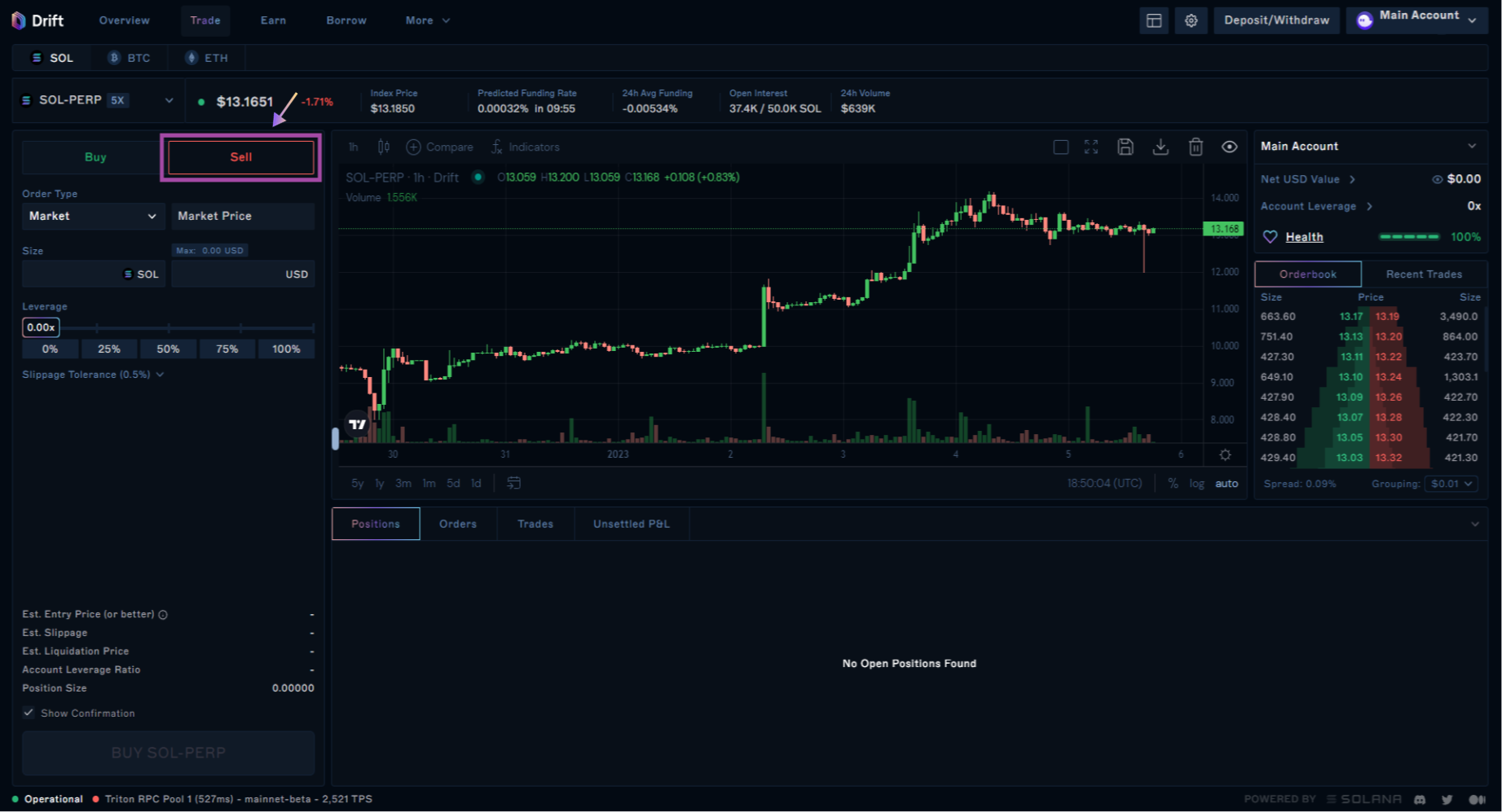 Navigate to Drift and select SOL-PERP from the drop down menu. Once you reach the SOL-PERP page, you’ll be able to sell i.e. short SOL-PERP, either by means of a market or a limit order. Review and confirm your trade details.