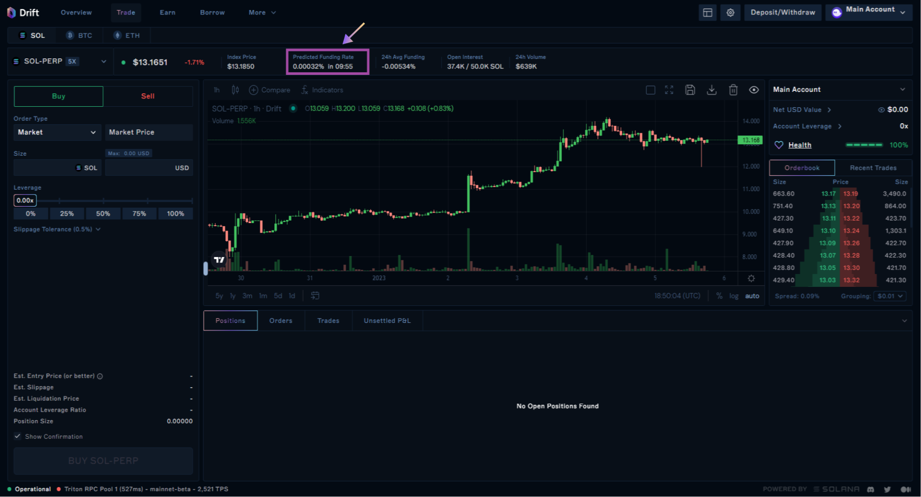 Navigate to the perpetual futures market for SOLUSDT-Perpetual/SOL-PERP on both Binance and Drift. Identify if there is a significant difference in funding rates between the perpetual market on both platforms.