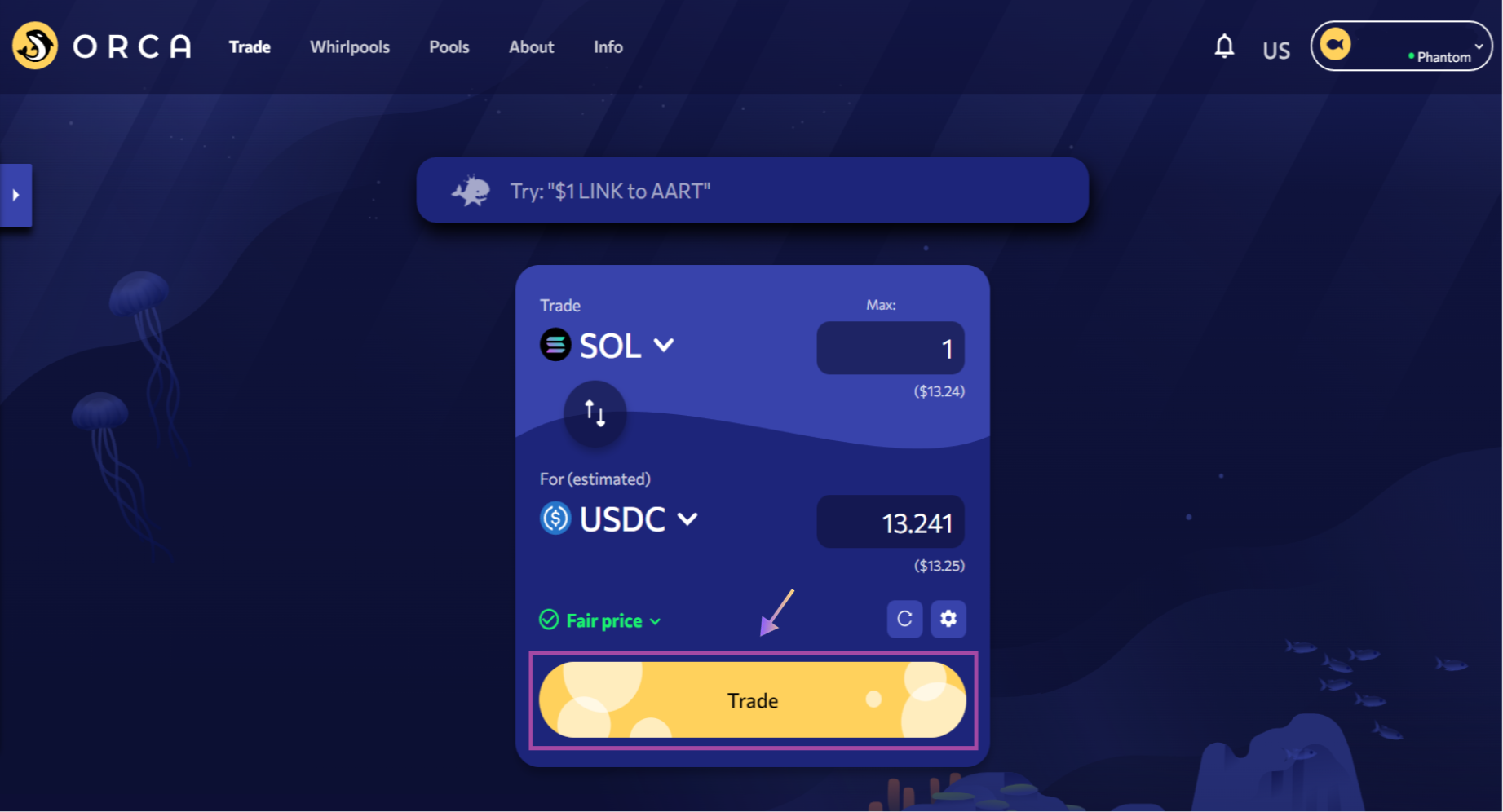 Click on the “Max” button for your SOL to select the entire amount you purchased. Start the process by clicking on the “Trade” button and confirm the transaction within your Solana wallet. After swapping, you’ve now successfully arbitraged SOL tokens between Binance and Orca for a profit of US$ 0.031/SOL minus fees.