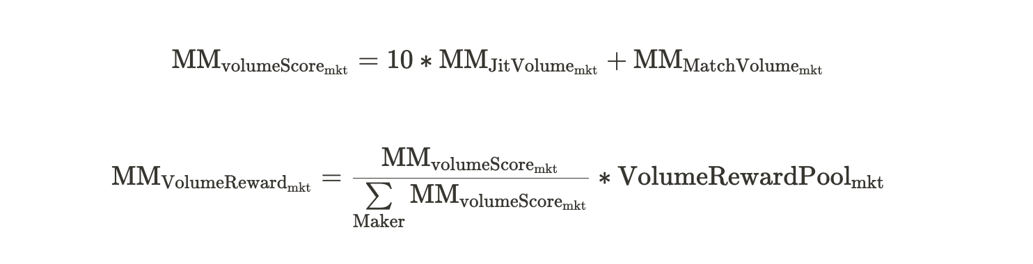 Given the efficiency and scaling improvements of offering JIT liquidity, MM volume that uses JIT fulfillmentwill get a 10x multiplier on their volume score. Thus matches performed by the keeper network earn a relatively smaller score.