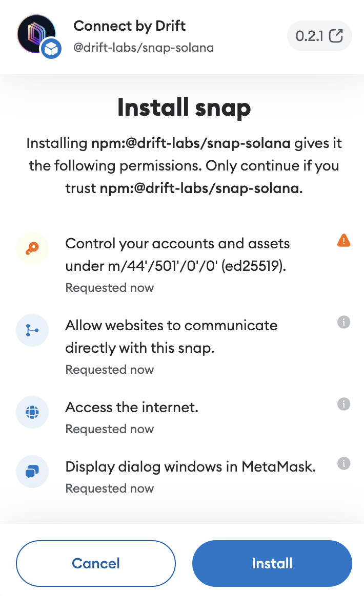 Next, you'll be prompted to connect to Drift via MetaMask Snaps.