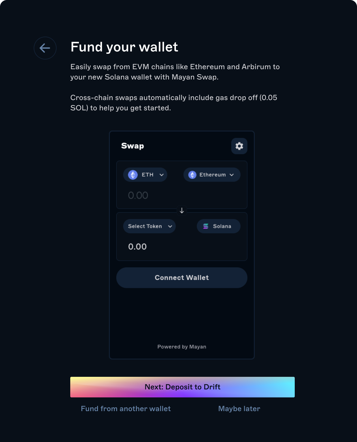 If you don’t have funds on Solana, Drift makes it easier than ever to bridge assets from EVM chains to your new wallet. After you connect, our integration with Mayan Swaps will allow you to effortlessly bridge assets like ETH, wBTC, and USDC from EVM chains like Ethereum and Arbitrum into native assets on Solana at the best prices possible!
