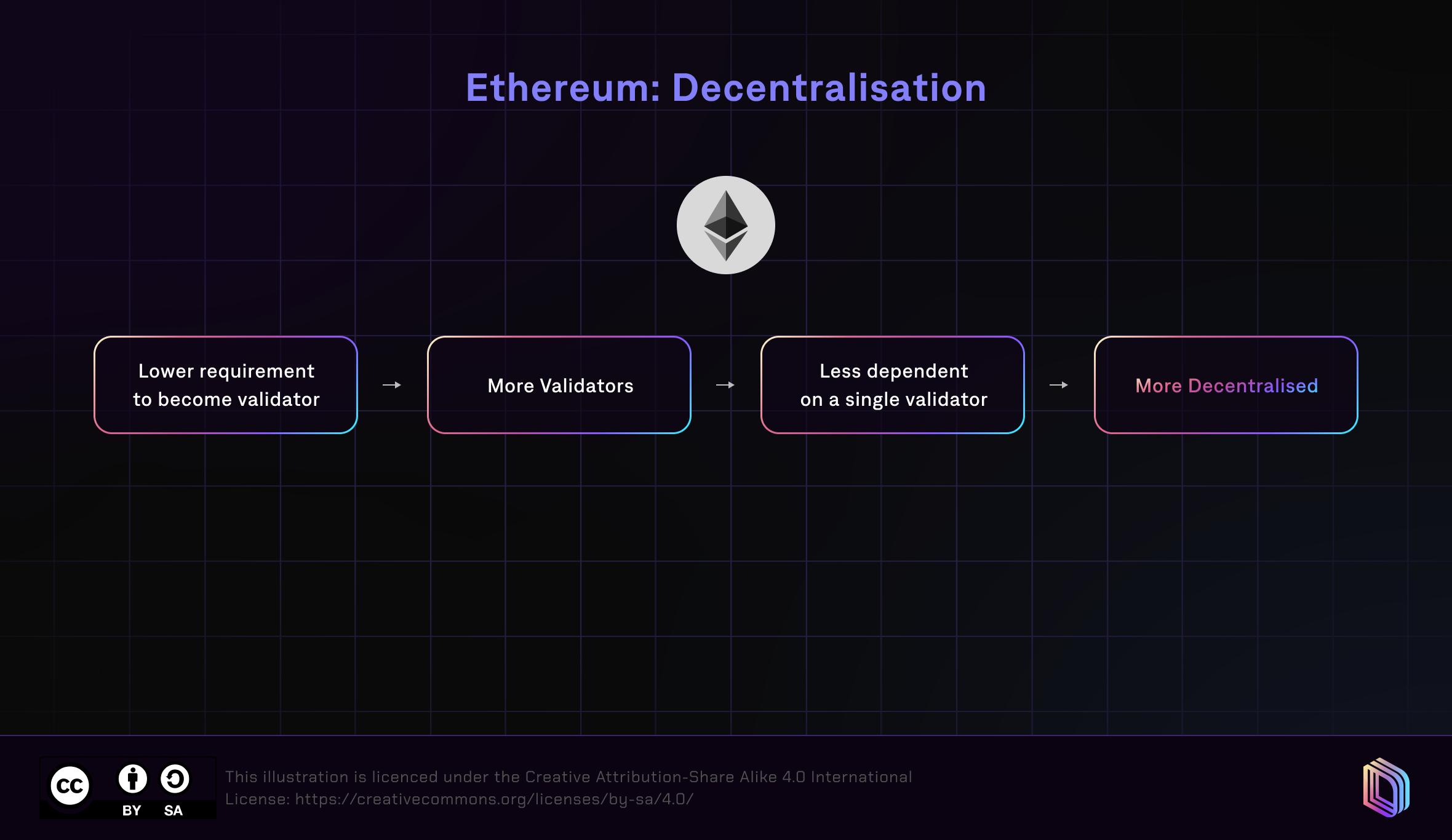Validators are responsible for adding new blocks to a blockchain, processing transactions and storing data, and are a backbone of blockchain technology. Since the technological requirement to become an Ethereum validator is relatively low, more people can run Ethereum validators profitably. This makes Ethereum less dependent on any one validator, which in turn results in a more decentralised network.