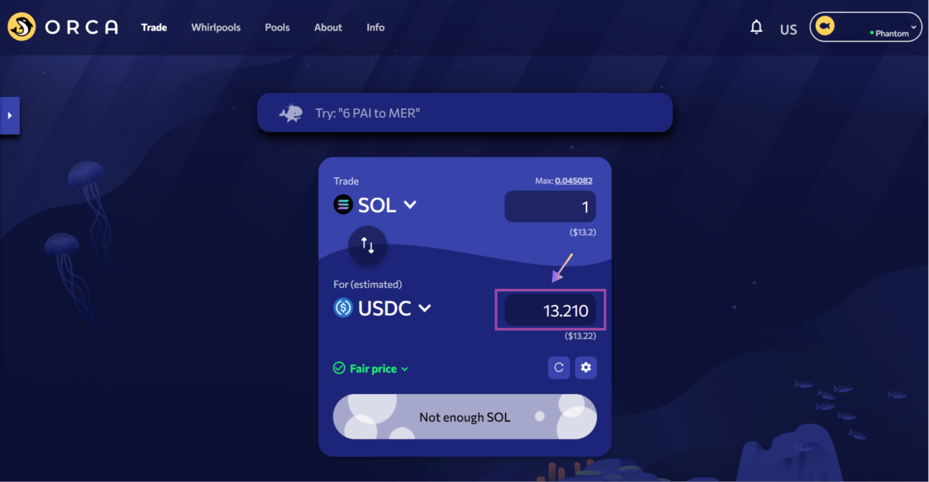 When your SOL tokens are available, go to Orca and connect your Solana wallet. Proceed to the “Swap” page of the DEX and configure the swap from SOL to USDC. Make sure that the SOL to USDC rate is still US$ 31.21 or at least higher than what you purchased it for on Binance.
