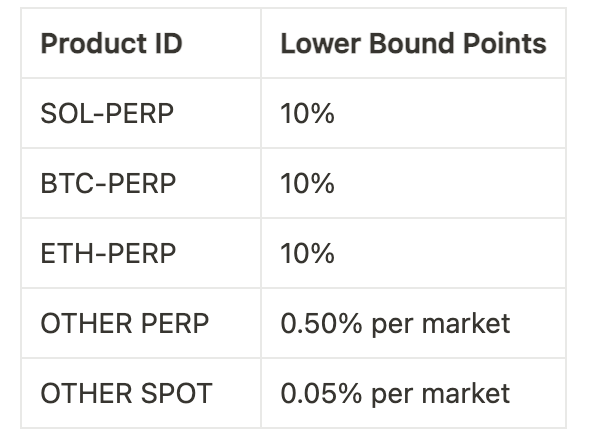 The percentages of points allocated to each listed market on Drift are defined below as a lower bound and updated consistently to reflect any changes. A full schedule of trading fees and rebates can be found here. Minimum points will be given to trading activity for each market.