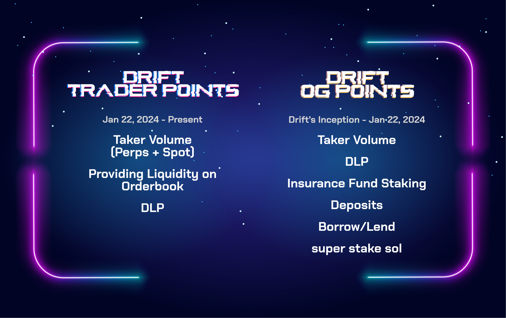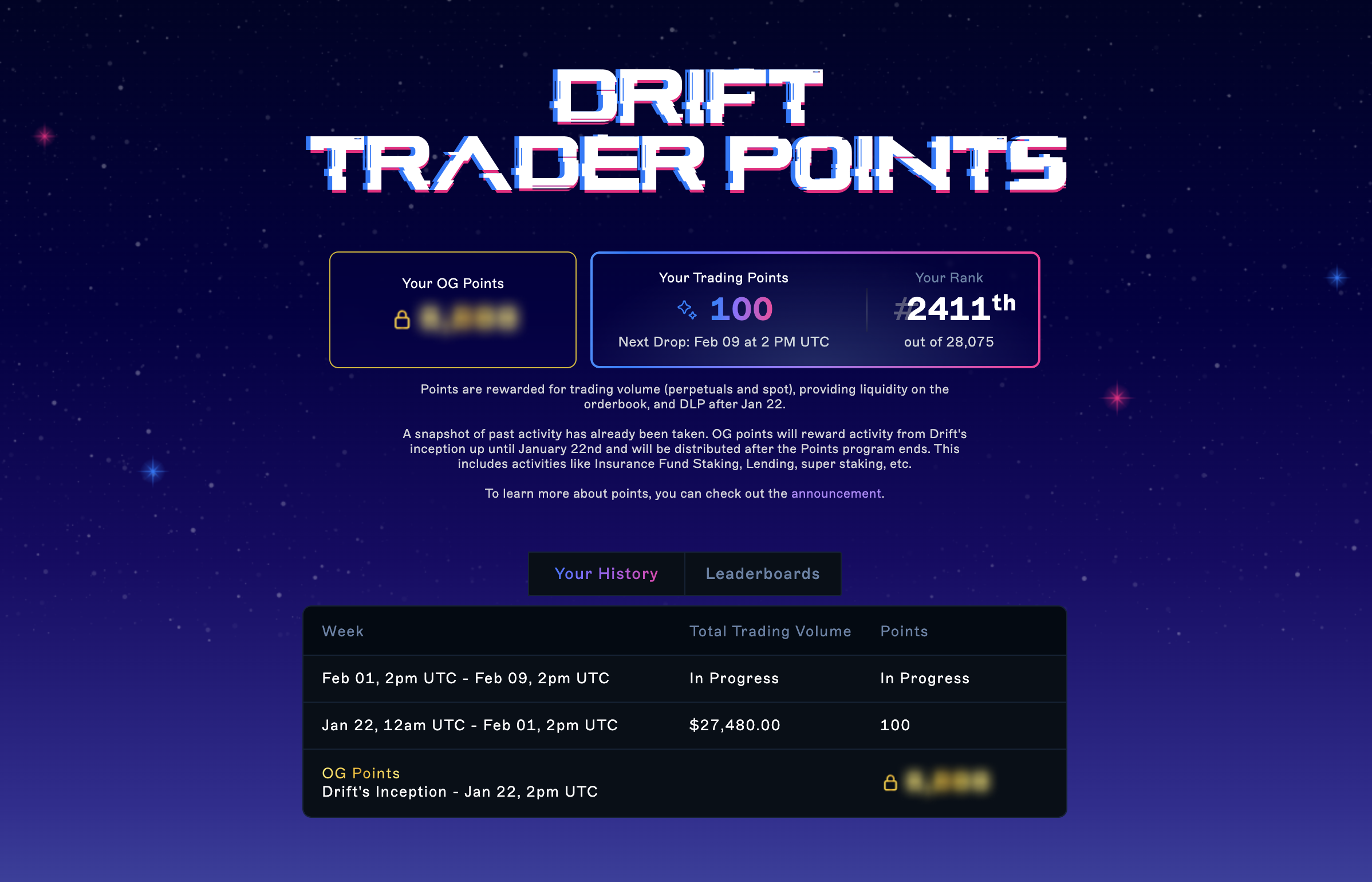 This will reward your past activity from Drift’s inception up to the beginning of the points program (Jan 22). OG points will be distributed after the Points program ends.